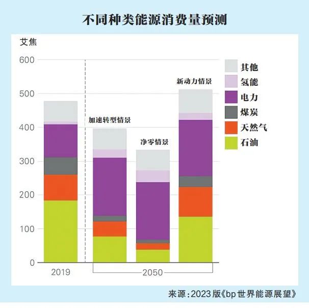 《bp世界能源展望》围绕3种能源转型情景展开,包括净零情景、加速转型情景和新动力情景。净零情景和加速转型情景假定全球气候政策大幅收紧。在净零情景下,到2050年,全球碳排放量将比2019年的水平减少约95%。在加速转型情景下,到2050年,全球碳排放量将减少约75%。社会观念和消费者行为的转变,将进一步提高能源利用效率,并增加低碳能源的使用。新动力情景旨在反映当前全球能源系统的整体运行轨迹,并将近年来各国政府的脱碳政策和承诺纳入考量。