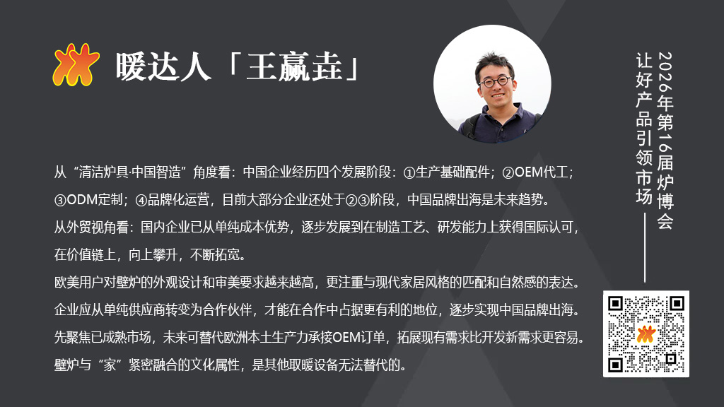 中国企业的机遇非常大。首先,中国制造的供应链和生产水平积累深厚,性价比优势明显,这里的性价比不仅指价格,还包括产品效率,很多中国工厂的生产效率已经超过国外老牌企业。国外壁炉行业多为老牌企业,工作和生产效率不高,而中国企业在生产端有明显优势,不一定需要取代国外品牌,反而有很多合作机会。