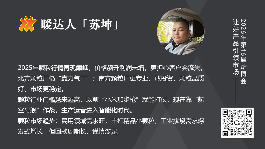 希望在明年的第16届炉博会上,能多展示一些颗粒生产的先进技术,比如管理系统、分选除杂设备等,能让更多的颗粒厂看到技术设备能提升原料和品质。也希望南北方的企业能多交流,北方企业应学习一下南方企业的思路,别再靠“拼力气”竞争了。最重要的是,让下游客户能看到优质颗粒的价值,别只盯着价格。好颗粒虽然贵一点,但能帮他们省更多的成本,这才是双赢。